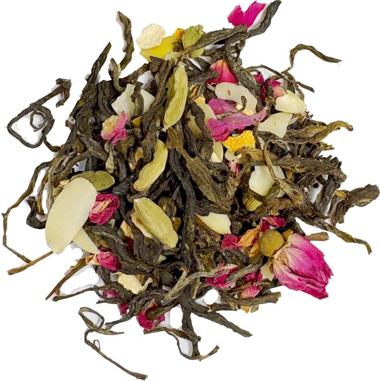 Skład: herbata zielona Yunnan OP, suszona gruszka, pąki róży, suszona skórka pomarańczy, płatki migdałów, kardamon, aromat naturalny owocowy.