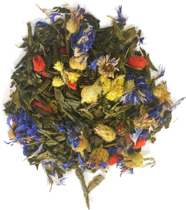 Skład: herbata zielona Sencha, owoc goji, kwiat kocanki, płatki bławatka, naturalny aromat owocowy wraz z innymi naturalnymi aromatami